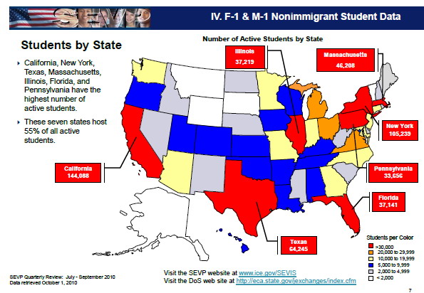 As of 30 September 2010, SEVIS (Student and Exchange Visitor Information System) contained records for 1,164,691 active nonimmigrant students, exchange visitors, and their dependents. The total number of records for all F-1, M-1, and J-1 visa holders is now 7.8 million.