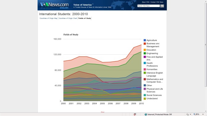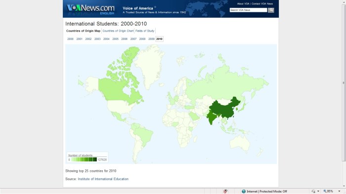Below are two charts with visuals of the top 15 sending countries in 2000 and the top 25 in 2010. The “fields of study” map at the bottom is a bonus. Using Open Doors data, Vietnam’s enrollment in 2001/02 was 2531 and was 13,112 in 2009/10, a 518% increase.