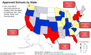 - California, New York, Texas, Massachusetts, Illinois, Florida and Pennsylvania host 55% of all active students 36% of all SEVP-approved schools are in California, New York, Florida, Texas and Pennsylvania. (Note: “An approved school may offer several levels of education from pre-school, elementary, high school, to post-secondary education level.”)