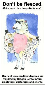 Speaking of states, if you’d like to see “where the operation of poor quality unaccredited degree suppliers is easy because of state laws that are poor, poorly enforced, or obscure” check out the map on the Oregon Office of Degree Authorization website.  You’ll find out why so many are based in California.