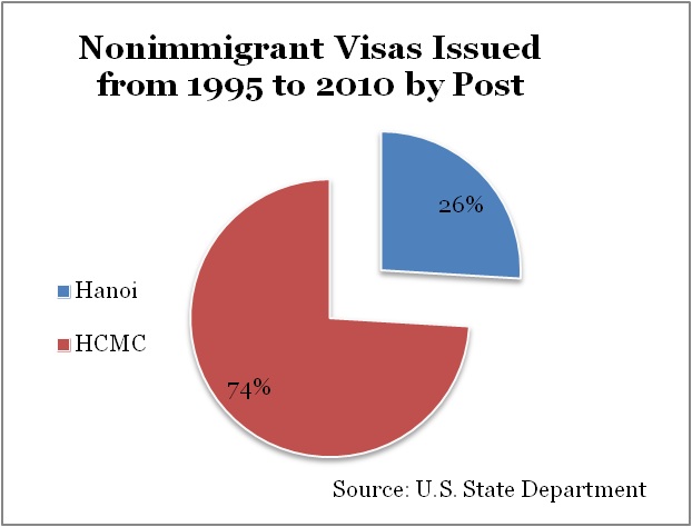 In keeping with my recent theme of visas, here’s some information about nonimmigrant visas issued over a 15-year period. From 1995, the year the US normalized diplomatic relations with Vietnam, to 2010, the US Mission issued a total of 318,335 nonimmigrant visas, including student visas. The Consulate General in Ho Chi Minh City (HCMC), which opened its doors in 1999, made up for lost time by issuing 235,751 over the next 12 years. The breakdown is 74% for the Consulate General and 26% for the Embassy.
