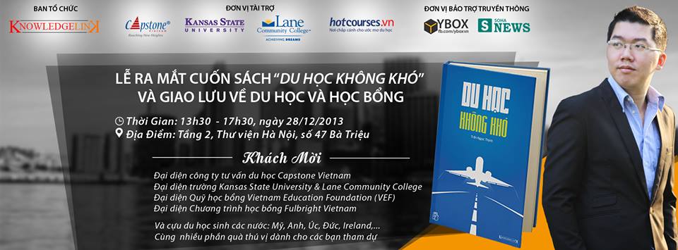 Capstone Vietnam, of which I’m managing director, and our International Academic Center (IAC) members, Kansas State University and Lane Community College (Eugene, OR), are proud to be sponsors of the book launch, the first event of which took place last Saturday afternoon in Hanoi.  I participated in a panel discussion with the author and a representative from the Vietnam Education Foundation (VEF).  As I mentioned in my concluding remarks, Du học không khó is a labor of love that Thịnh wrote as a means of giving back and, to borrow a slogan from VietAbroader, a way to “pass the torch” to younger people, some of whom will follow in his footsteps.