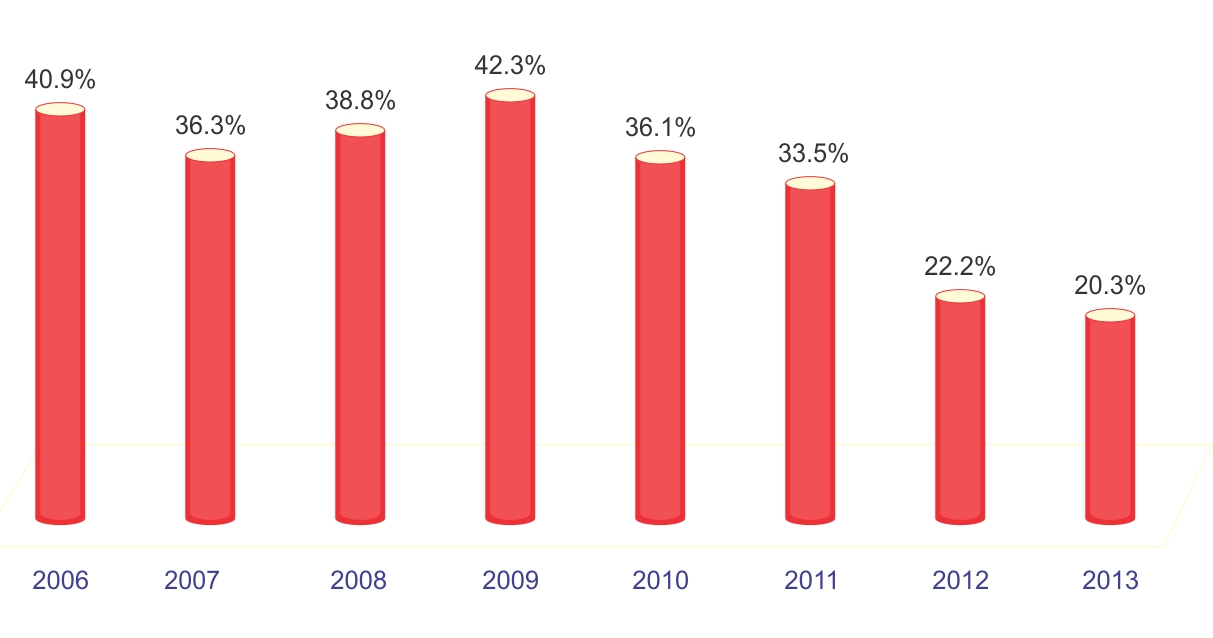This graph illustrates some ups and downs and then a steady decline in the refusal rate starting in 2010.