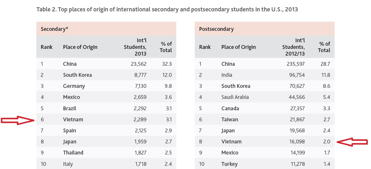 Surprisingly, Vietnam ranks 6th – in the same tier as Brazil (#5) and Mexico (#4). This means that last year 12.4% of all Vietnamese students were attending a US high school or boarding school and 87.5% were enrolled in an institution of higher education. 2,052 were on a F-1, while 237 were on a J-1 visa. They comprised 3.1% of all international secondary students.