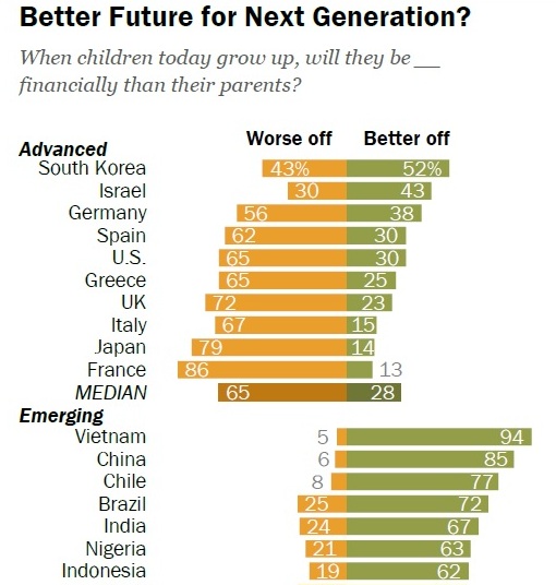 As they continue to struggle with the effects of the Great Recession, publics in advanced economies are pessimistic about the financial prospects for the next generation. Most of those surveyed in richer nations think children in their country will be worse off financially than their parents. In contrast, emerging and developing nations are more optimistic that the next generation will have a higher standard of living.