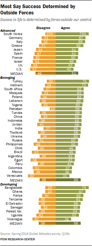 Vietnam ranked second among the emerging countries in response to the question about what contributes to success in life with 73% saying that it is determined by forces outside our control.” This is not surprising, given the prevailing cultural view of fate vs. individual control over one’s life, as in the US, for example, and the importance of family and other relationships, your horoscope, fortune-telling, etc. The US falls at the other end of the spectrum with 57% disagreeing with this statement. Its view is rooted in the “American Dream” which, for most, is cultural mythology. The truth falls in that vast expanse of gray in which success is determined by “forces outside our control” and individual talents, interests and efforts.