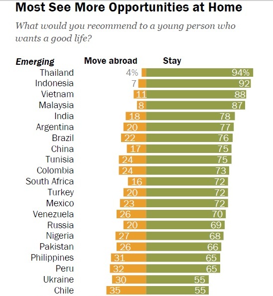 Looking ahead, people in the emerging and developing world see better opportunities at home than abroad. Majorities or pluralities in 30 of the 34 emerging and developing nations surveyed say they would tell young people in their country to stay at home in order to lead a good life, instead of moving to another country. This, of course, is the future of many of these countries.