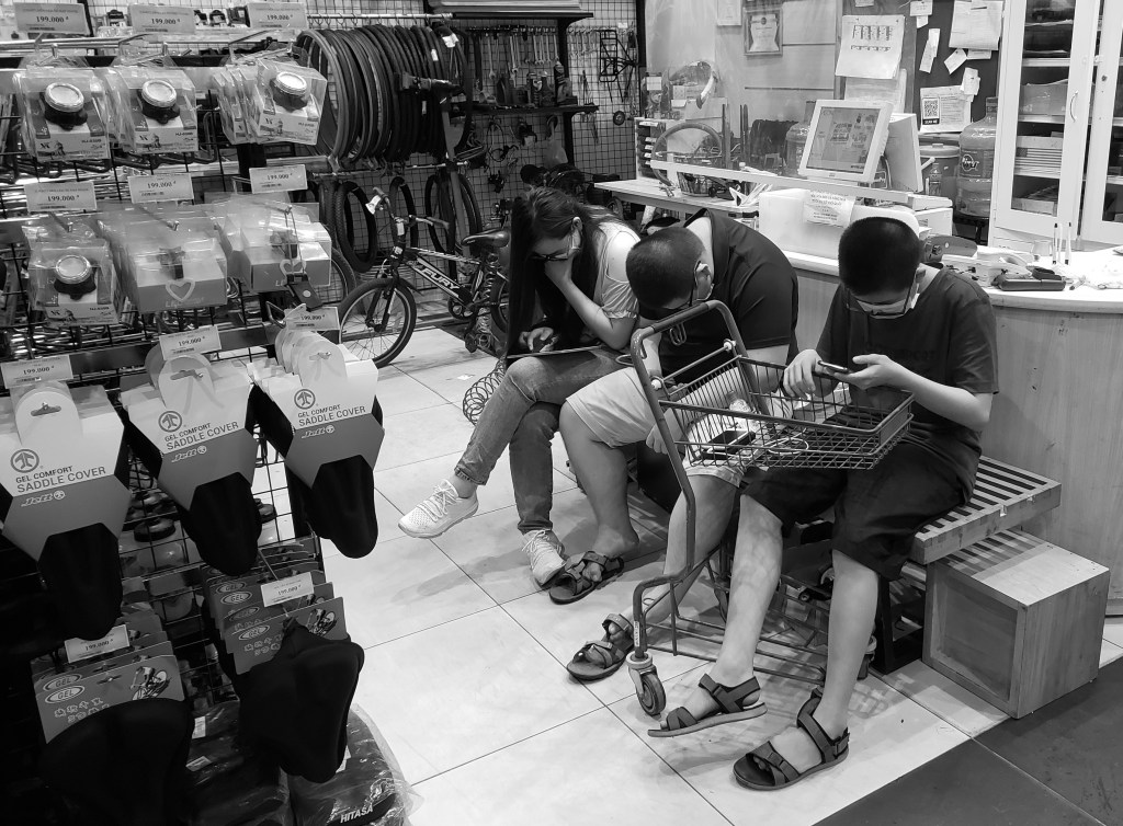 As seen in a shopping center in Viet Nam. I normally don’t make a habit of photographing people without their permission but with no identifying features – they’re all looking down and wearing face masks – I didn’t feel it was necessary with these three.