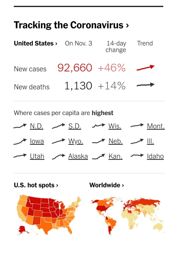 This is what the COVID-19 situation looked like on Election Day, 3 November, in the US. Note the 14-day increase in number of new infections and deaths. Also note that most of the states where cases per capita are the highest are red states.