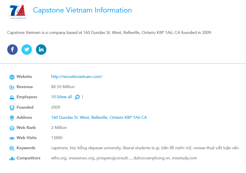 I was recently searching for something online and came across this RocketReach (RR) profile of Capstone Vietnam. (Full disclosure/reminder: I’m managing director and co-founder.) RR is a web-based tool that mines data to create profiles of companies that include website addresses, social media channels, and email addresses, among other information. The results illustrate the current limitations of this kind of data mining. The company was founded in 2015 and is based in Bellevue, WA.