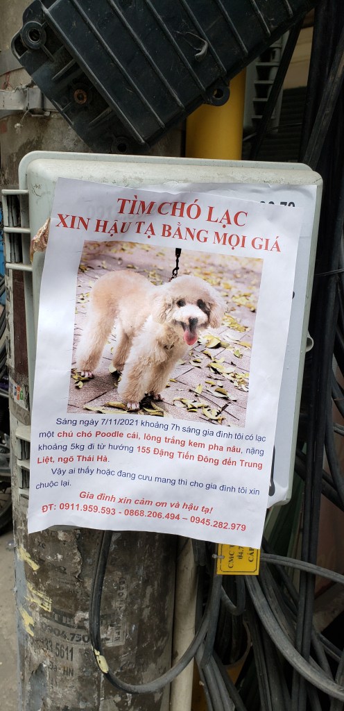 Moral of the story: If you own a dog and/or cat in Viet Nam, don’t let it roam free. Depending upon where you live, there’s a very good chance it will disappear with no hope of recovery. (Yes, there are also restaurants that feature tiểu hổ (little tiger, i.e., cat meat) on the menu.