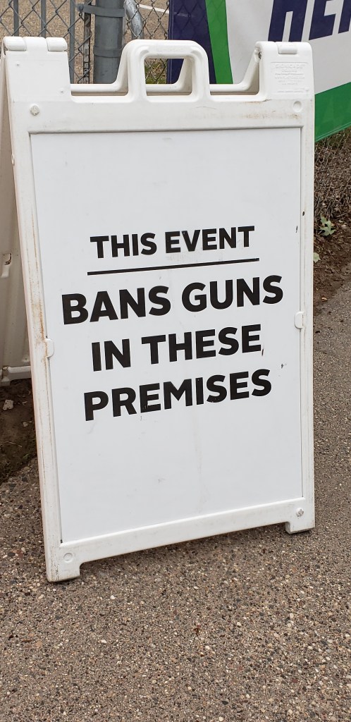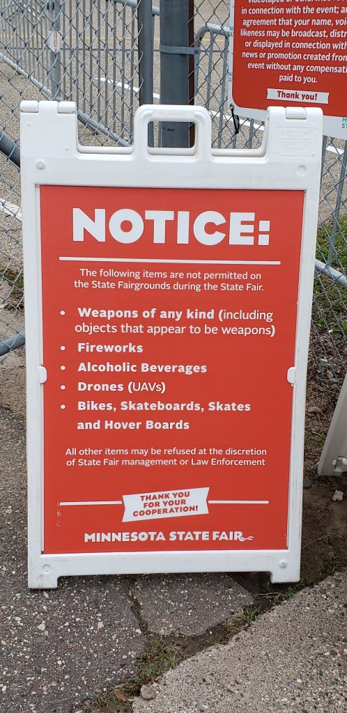 I took these two photos at the soft launch of the Minnesota State Fair in late May. There is good reason for this warning. State residents who are at least 21-years-old and complete a firearms training course may carry firearms visibly in public, known as open carry, or concealed. The law doesn’t make a distinction between the two.