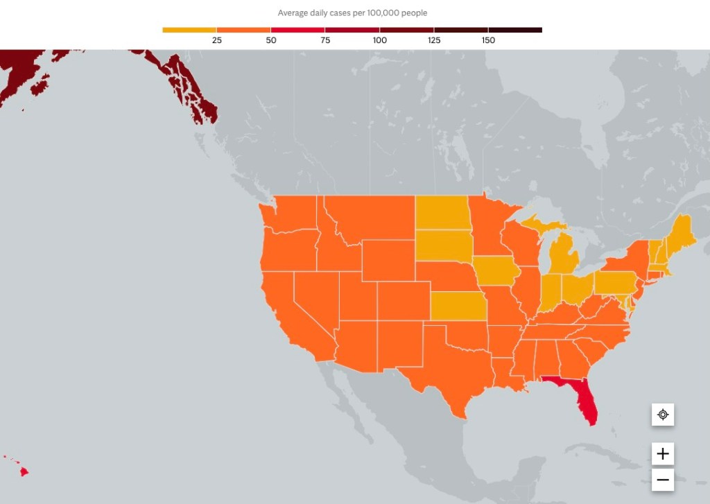 Miracle of miracles, I wasn’t infected during the month-long trip. It was obvious that “freedumb” reigns supreme in the land of the free. It was like I missed the breaking news that COVID had been eradicated in the US. I would estimate that about 5% of the people I saw were wearing a mask. My interior monologue identified them as the smart ones. The 95% sans mask – not so much.