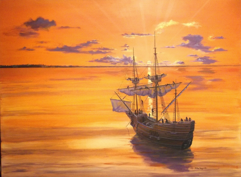 This image accompanied a message I received from the General Society of Mayflower Descendants (GSMD), of which I’m a member: The Mayflower Society wishes you a healthy and happy Thanksgiving! It’s an idealized view, glorious rays of sunshine and all, of a ship that brought saints and strangers, Puritans who came to be known as the Pilgrims, to their New World in 1620. For many Native Americans, Thanksgiving is a National Day of Mourning.