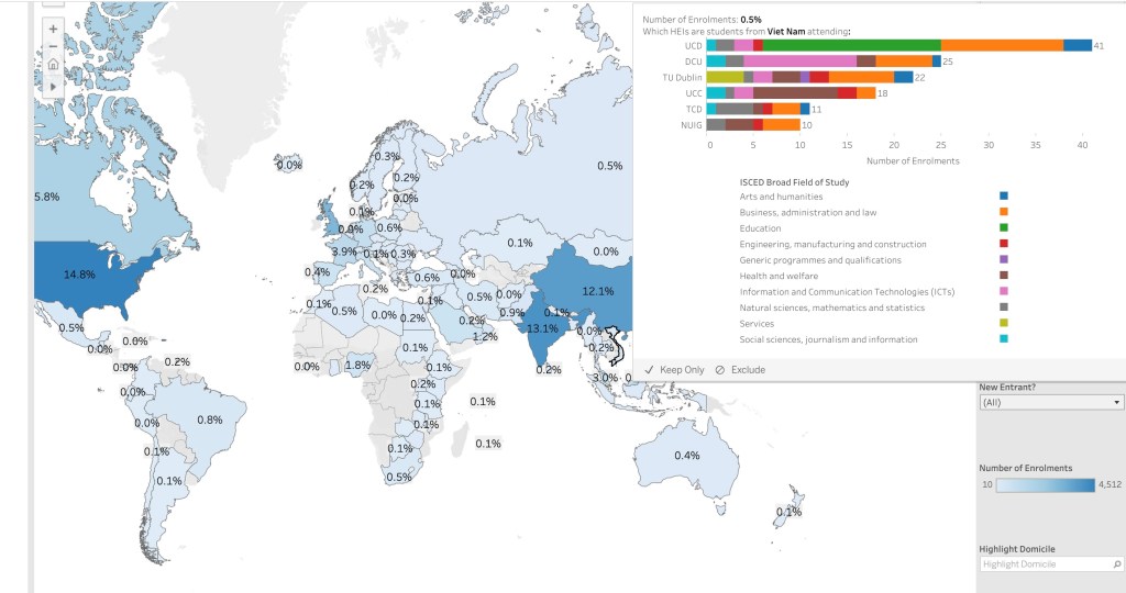 She informed me that there are “approximately 152 Vietnamese students studying in Irish higher education institution in 2021/22. These are the most up to date figures I have access to.” Click on this link to see international enrollments figures for that year for Vietnam and other countries of interest. According to the Higher Education Authority (HEA), 0.5% of all international students were from Vietnam. (It appears that 127 Vietnamese students were in Ireland that year.) In addition to enrollment figures, these data include host institutions and fields of study, thus making Ireland one of the few countries that provides this useful information.