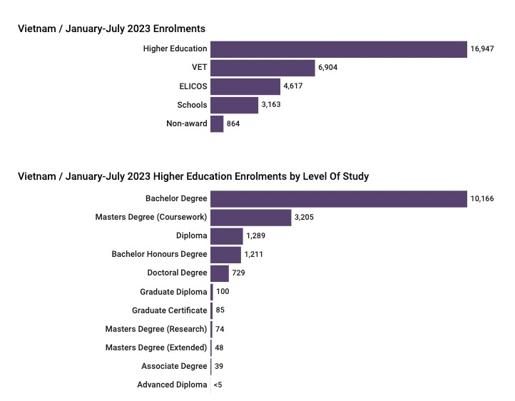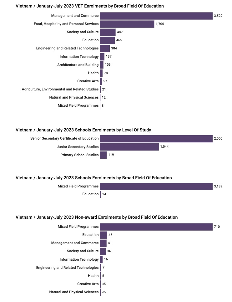 Australia has surpassed the US as the world’s leading English-speaking host of Vietnamese students, according to the Australian Department of Education. As of July 2023, there were 27,764 Vietnamese students in Australia, 4% of the total international enrollment and a 39% growth rate compared to the same period last year. As in the US, which enrolled 24,072 Vietnamese students at all levels in September 2023, Vietnam ranks 6th among sending countries. The total number of international students in Australia during the January-July 2023 period was 710,893, a 34% increase over the same period in 2022.