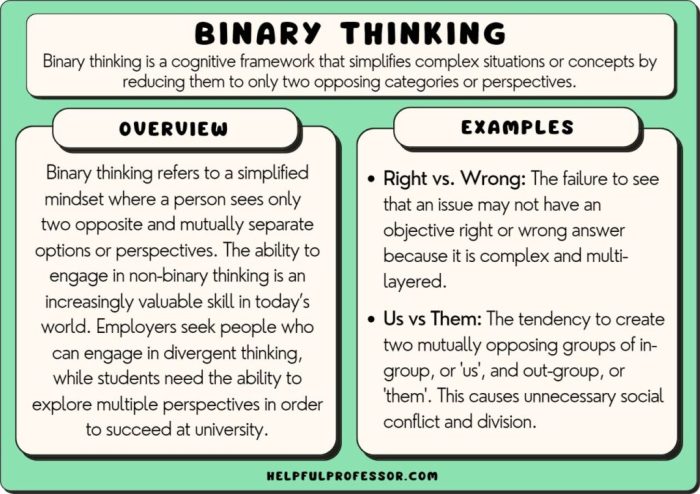 Extreme binary, either/or thinking—also known as black-and-white thinking or false dichotomy—is a cognitive distortion that frames complex realities in simplistic terms: something is either completely right or completely wrong, good or evil, success or failure, us or them. While binaries can and do offer clarity in certain contexts, when over-applied or absolutized, they distort reality, damage relationships, hinder growth, and even perpetuate injustice.