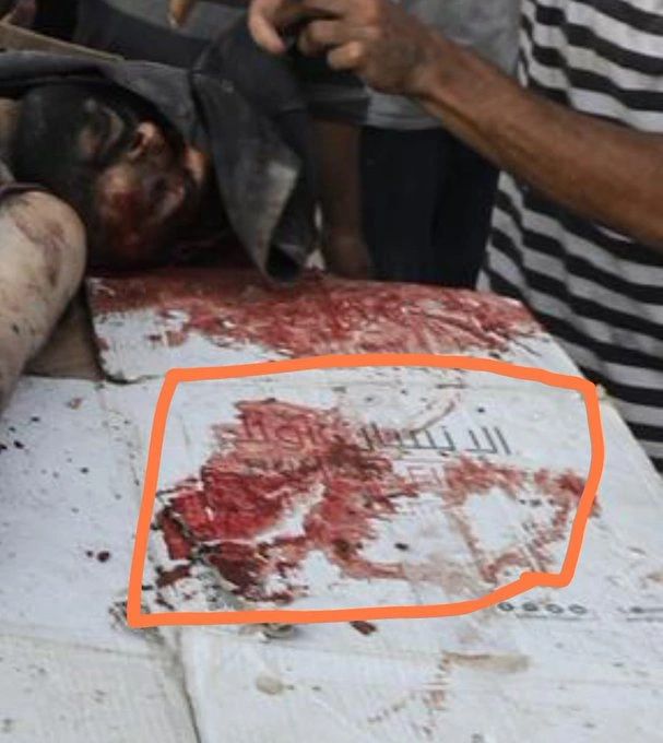 Here is the photo: the remains of a Palestinian body lying atop a box labeled “Human First”—a cruel monument built beneath us by a so-called humanitarian force.