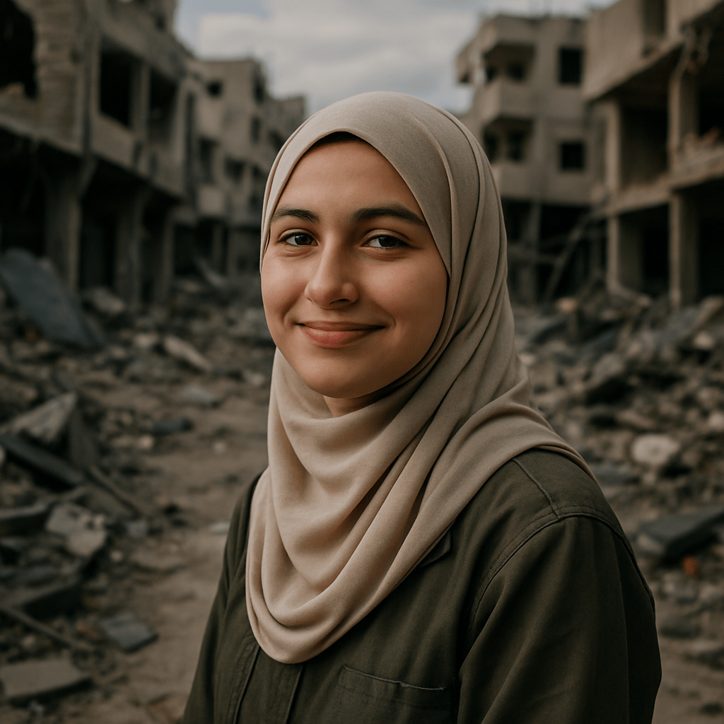 To create the AI-generated photo above, I asked ChatGPT “to create an image of a 19-year-old woman in Gaza who always try to remain positive and hopeful in the tough situation she and others there are currently facing.” While I initially liked another version more, I changed my mind after looking at this image again. (The woman who is the subject of this post agrees.) It really captures a young woman trying to “remain positive and hopeful in the tough situation she and others there are currently facing.” Grace and determination amid violence and desperation.