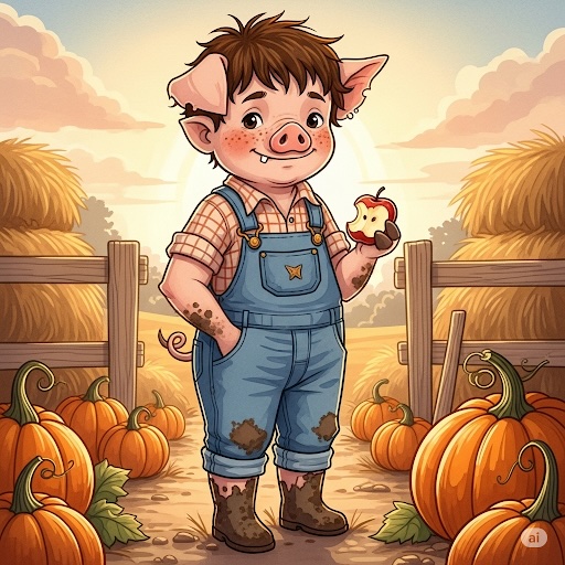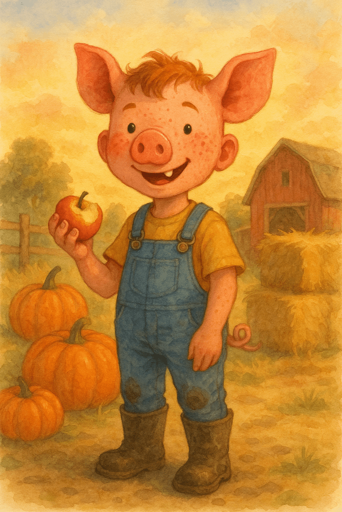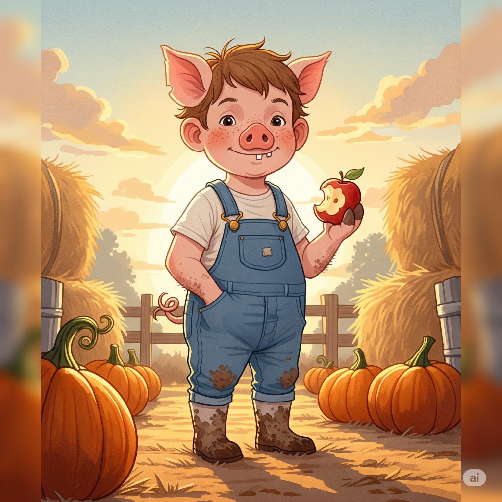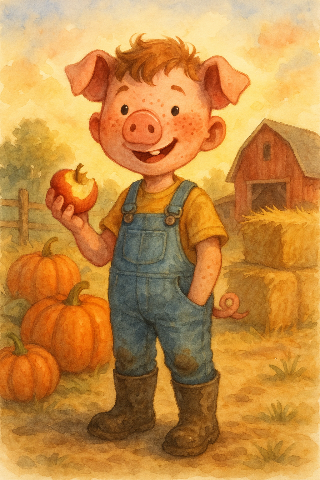 “Whimsical pig-boy hybrid character, 10-year-old human body with subtle pig features (snout, ears, tail), wearing muddy overalls and boots in a farmyard at sunset holding an apple, watercolor illustration style, soft lighting, detailed textures, playful mood –ar 16:9”