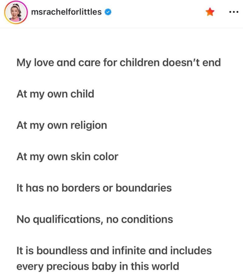Imagine what the world would be like if we all adopted this simple moral code and embraced Ms. Rachel’s statement about children (and adults) everywhere, the essence of global citizenship. (See the graphic below.) No more overlapping ideologies like colonialism, fundamentalism, nationalism, racism, tribalism, and Zionism, all of which are essentially death cults with in- and out-groups, a sense of superiority among the chosen ones, and demonization and dehumanization of “the other.” Imagine what the world would be like if we rejected brutality and violence in favor of caring, concern, and compassion?