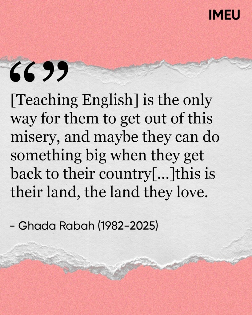The ELT community in Palestine lost far more than a teacher when Israel killed our dear colleague Ghada Rabah. We lost a voice of integrity, a mentor, and a lifelong learner who held space for so many of us to grow.