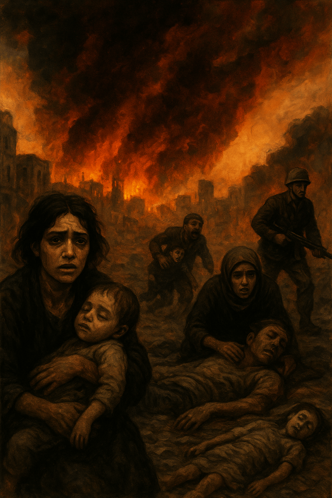 انظروا إلى عيون الناس الذين يستولِي عليهم رعب لا يضاهى حتى في أحلك لحظات هذه الإبادة المستمرة منذ عامين. شاهدوا صفوف الأطفال المغطّين بالرماد مستلقين على أرضٍ مشبعة بالدم فيما كان ذات يوم مركزًا طبيًا — بعضهم بالكاد على قيد الحياة، والآخرون يصرخون ألمًا وخوفًا — بينما تحاول أيادٍ يائسة مواساتهم أو علاجهم بما تبقَّى من مستلزمات طبية. اسمعوا صرخات العائلات التي تفرّ بلا ملاذ، وكونوا شهودًا على الآباء الذين يجوبون الجحيم بحثًا عن أطفالهم؛ أطراف تبرز من تحت الركام؛ ومسعف يحتضن فتاة بلا حراك متوسلًا إليها أن تفتح عينيها — بلا جدوى.