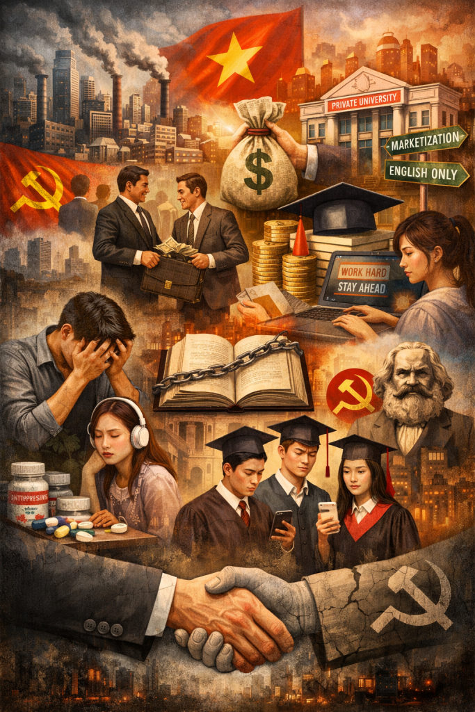 Over the last three decades, Vietnam has experienced significant economic growth, with millions lifted out of extreme poverty through economic reforms and global economic integration. However, assumptions within this dominant discourse have largely gone unchallenged. This study aims to use a neoliberalism lens and critical theory approach to develop an alternative view of the current developmental trend in Vietnam. The analysis consists of three interconnected themes: political economy, higher education, and subjectivity. I argue that neoliberalism – as an economic paradigm – leads to the emergence of rent-seekers and a crony capitalist economy despite being under a socialist state. The dual impact of the rent-seeking economy and neoliberal globalization has promoted higher education neoliberalization, featuring financial autonomy, privatization, marketization, and Englishization. This transition also creates certain vulnerabilities that manifest through education commodification, ideological domination, and hegemony. Under such a system, educated youths exhibit characteristics of neoliberal subjectivity and experience a range of mental illnesses, disproportionately more than the general population. The study ends with a discussion on the tensions (or lack thereof) between socialism and neoliberalism.