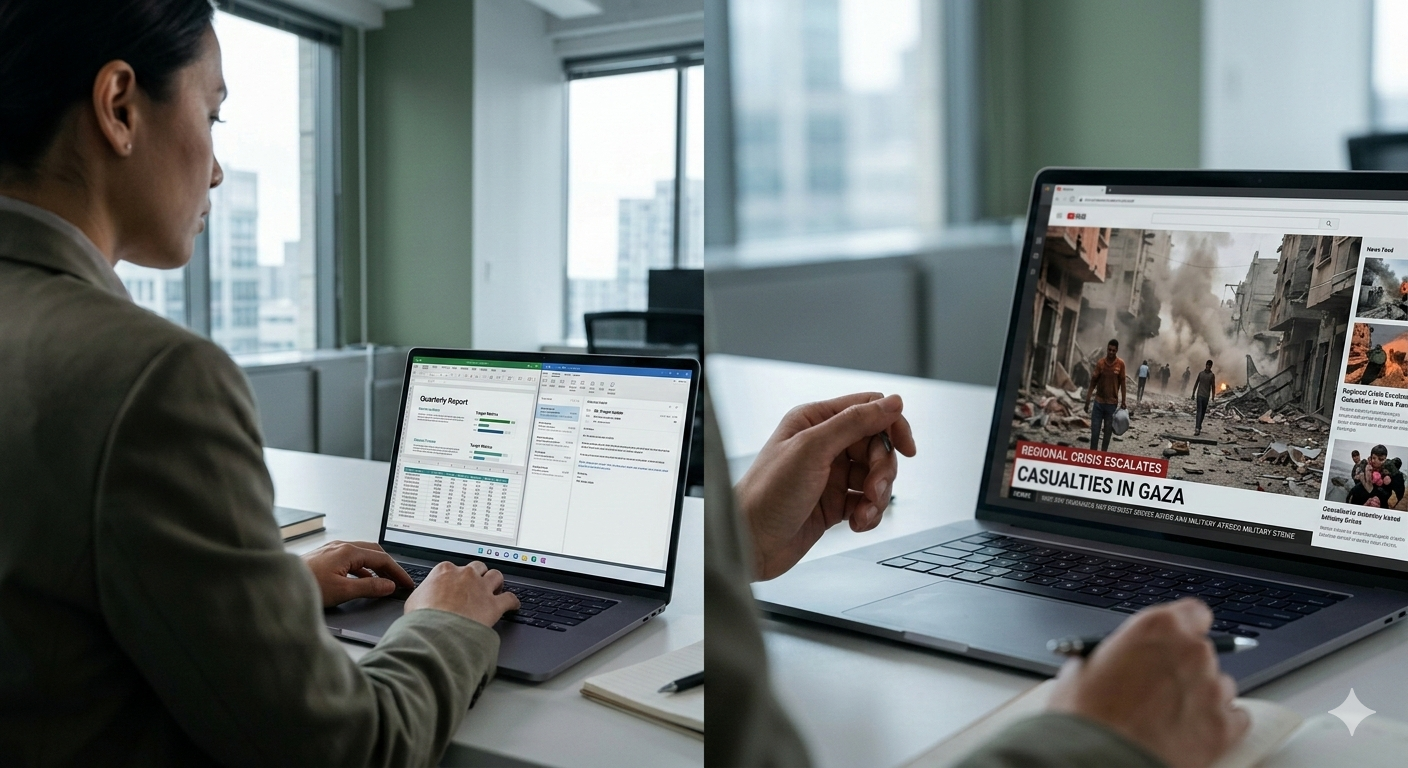The dissonance is sharp. You sit in meetings discussing marginal gains while watching mass death unfold in high definition. You contribute thoughtfully to conversations that, in another time, would have felt important but now feel faintly unreal.