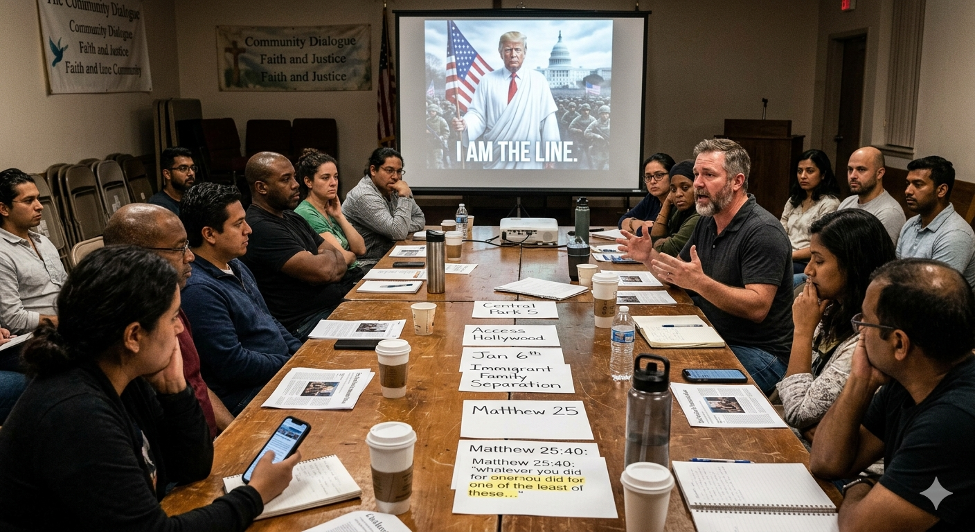 But the line was when the president depicted himself as Jesus. White Jesus. Americanized Jesus. Militarized Jesus.